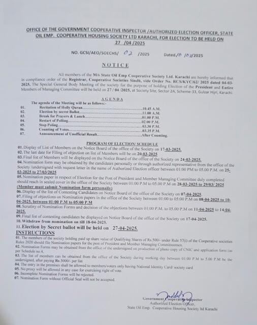 All members of the M/s State Oil Employees Cooperative Society Ltd. Karachi are hereby informed that in compliance order of the Registrar, Cooperative Societies Sindh, vide Order No. RCS/KYC/62/ 2025 dated 04-03-2025, The Special General Body Meeting of the society for the purpose of holding Election of the President and Entire Members of Managing Committee will be held on 27 / 04 / 2025, at Society Site, Sector 2A, Scheme-33, Gulzar Hijri, Karachi.